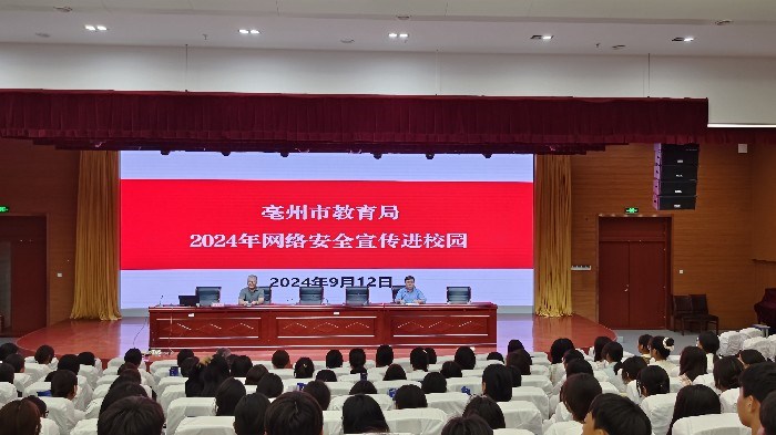 本次活动是2024年亳州市教育系统网络安全宣传周系列活动之一,通过宣讲进一步提高学生的网络安全素养,引导学生树立正确的网络安全观念,增强网络安全防范意识。市教育局宣教中心主任张秀礼为学生们上了一堂题为《网络沉迷 vs 开卷有益》的网络安全宣讲课。该校2024 级师生代表 300 余人共同聆听了宣讲课。