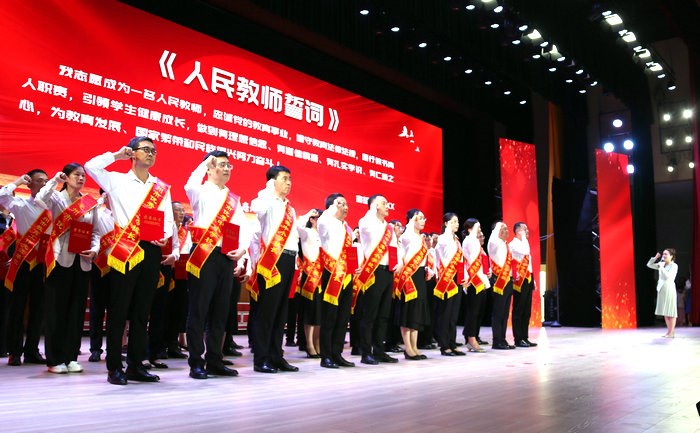 谯城区颜集镇李集小学教师吕媛媛以深耕在基层一线教师的真实感悟,发出了全市7.6万名教师“躬耕教坛,强国有我”心声,引起了现场所有教育工作者的共鸣,大家起立举起右拳,集体喊出《人民教师誓词》的最强音,表达了坚守立德树人初心,牢记为党育人、为国育才的坚强决心和信念。