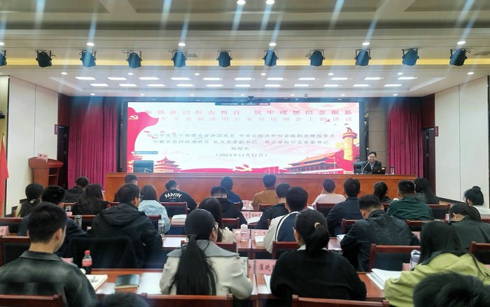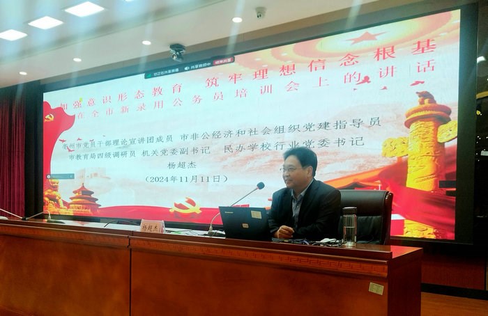 11月11日,市党员干部理论宣讲团成员、市教育局四级调研员杨超杰走进全市新录用公务员培训会场,对全体学员进行意识形态教育,帮助他们筑牢理想信念根基,走好从“正”之路。