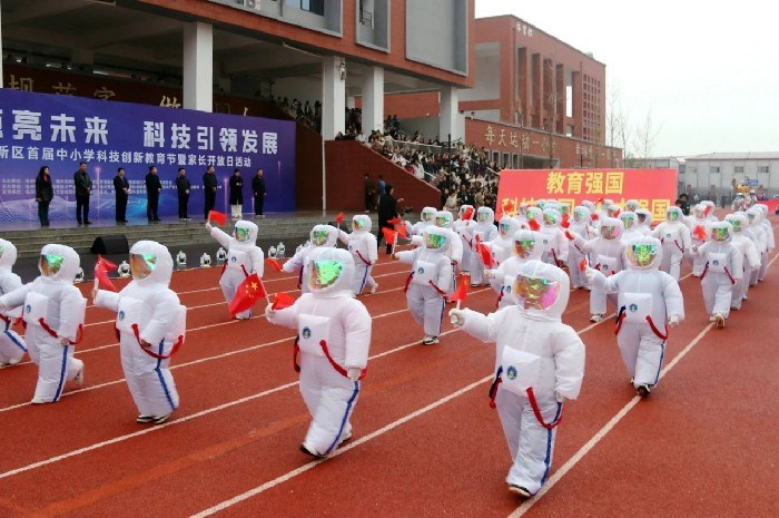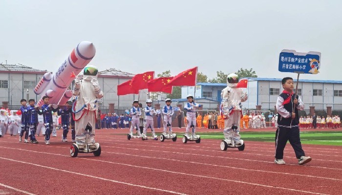 在活动开幕式上,伴随着激昂的乐曲,各参赛队伍依次入场。亳州市第一小学方队队员身着宇航服,步伐整齐,拼成了歼20飞机模型的队形,展现了对航空科技的无限热爱。亳州市第九小学方队队员手持航天员模型,彰显了向星河宇宙探索的决心和勇气。亳州市第五小学科创方队队员以“科技引领,创新驱动;智慧之光,点亮未来”为信念,步伐自信而矫健。此外,亳州三十一中、亳州四小、亳州学院附属学校和高新区翰林小学的代表队也各具特色,充分展示学校在科技创新教育方面的成果和风采。学生代表的发言铿锵有力,表达了对科技创新的热爱和追求。