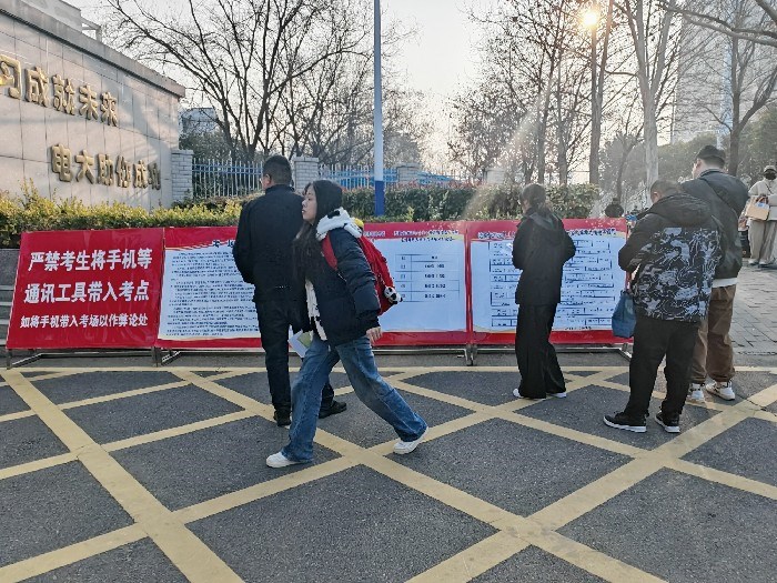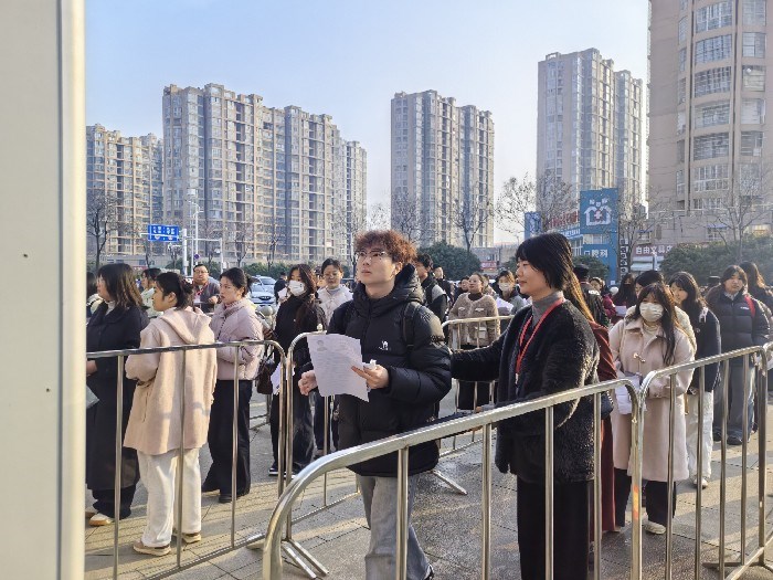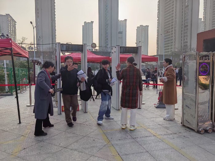 当日早上8:00不到,广大考生便赶到各考点,在大门外排队等候进场。一些考生一边排队,一边争分夺秒地看复习资料,期待有个好的结果。进场时间一到,各考点进场通道按时开启,在工作人员的引导下,考生凭有效身份证和准考证,通过智能安检门有序进入考点。