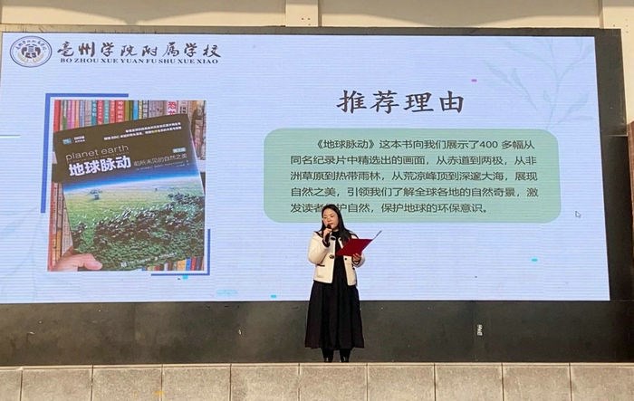 “从深海到平原,从沙漠到雨林,都能领略地球的丰富与美丽,感受大自然的奇妙与生命的顽强。”亳州学院附属学校教师尹静分享了科普书籍《地球脉动》,介绍了该书通过400多幅照片展示各种神奇自然景观。“希望通过‘慧阅读’书籍分享活动,激发学生的好奇心和探索欲,让孩子们直观地了解地球生物多样性和生态系统的复杂性。通过充分认识人类活动对生态环境的影响,进一步增强环保意识,自觉培养热爱自然、保护地球的责任感。”亳州学院附属学校校长茹磊说。