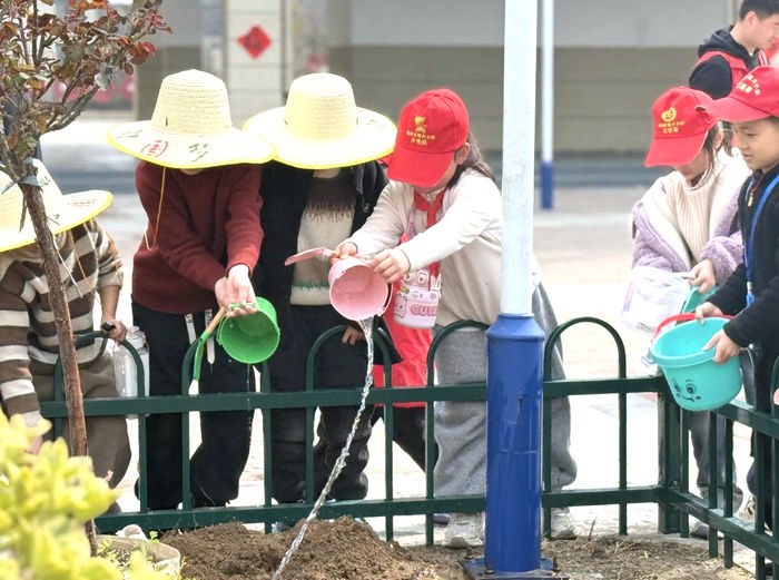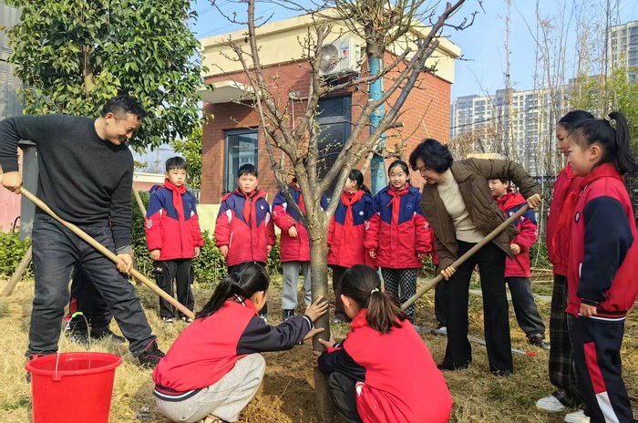 在亳州六小、亳州市夏侯小学校园内,师生们共同参与“播种绿色希望 收获美好未来”植树节活动,为美丽的校园增添新绿。大家分工协作,有的挖坑、有的扶树、有的填土、有的浇水,每个环节都进行得有条不紊。经过一上午的努力,一棵棵小树苗在校园里“安家落户”,为校园增添了生机与活力。