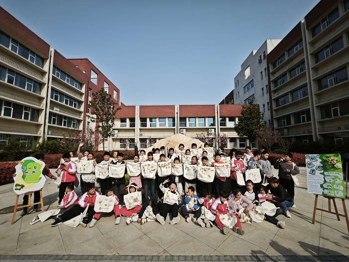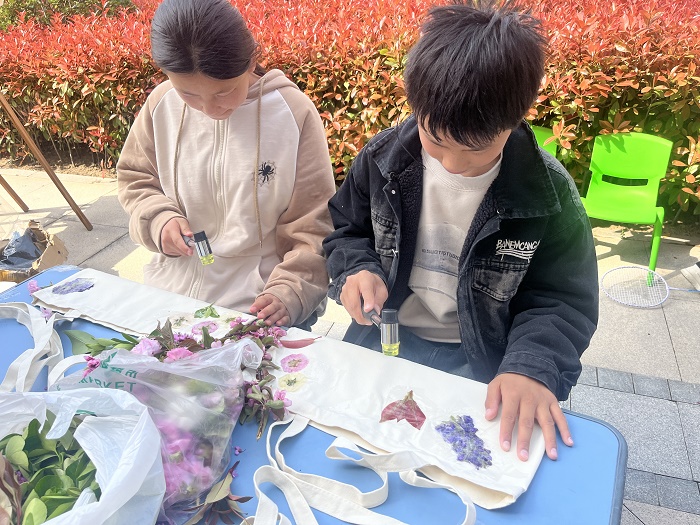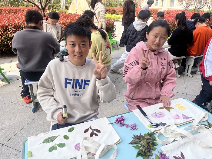 活动期间,师生首先通过“春日小课堂”学习樱花、蒲公英等春季植物知识,了解环保袋的作用;随后分组到户外收集落叶、花瓣等自然素材;最后用敲拓染工艺将植物图案印制在环保袋上,创作个性化“春日手袋”。