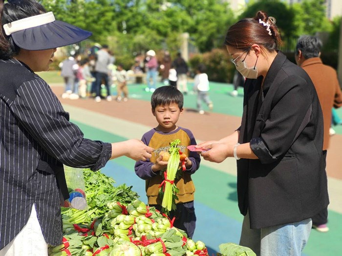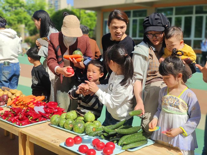 活动现场热闹非凡,小朋友们在家长陪伴下,带着自己闲置的绘本、故事书、科普读物等图书放到 “图书柜”中并与同伴进行分享,交流心得换取能量币。家长和孩子们积极踊跃的参加“蔬菜套圈乐”“挖土豆”“春种秋收”“一园青菜成了精”等系列亲子游戏活动。通过游戏闯关的形式兑换蔬菜能量币,以便用来换取新鲜蔬菜。西兰花、胡萝卜、小青菜、茄子、土豆等蔬菜摆放整齐,老师们耐心讲解每种蔬菜营养价值。兑换到蔬菜后,孩子们脸上洋溢着喜悦。此次活动的书籍将捐献给乐阳社区供适龄幼儿分享阅读。