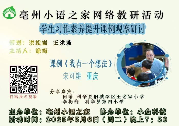 5月6日晚,“亳州小语之家”围绕“学生习作素养提升”主题开展网络教研活动,通过课例观摩研讨,交流习作教学策略,探索小学语文习作教学新路径。近500名小学语文教师线上参与活动。