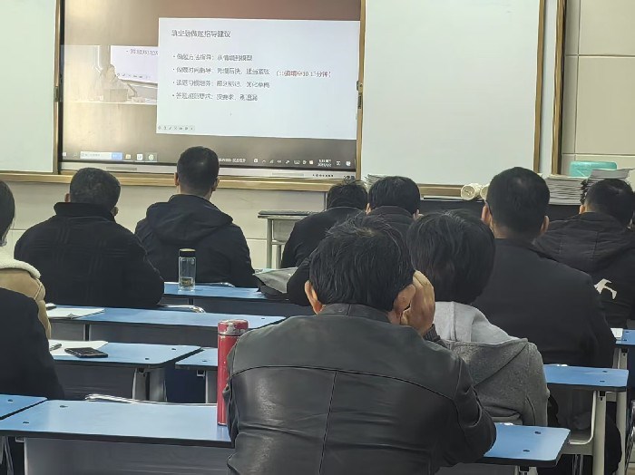 市教科所副所长、兼职物理教研员程齐苗要求大家认真研读课标,在明晰学业质量要求的基础上注重学生问题解决能力,培养学生综合素养;要回归教材,关注各版本教材中的例题和练习;要认真研究历年真题,通过梳理、归类、分析,明确命题方向和趋势,明晰学业水平考试对学生综合能力和核心素养的考查;要以生为本、分层指导,通过检测诊断学生学习中的问题,不同学生的不同问题,制定多样化的指导方法,以学定教。要根据学校和学生实际优化本校和各班级二轮复习计划,增强复习的针对性和有效性。