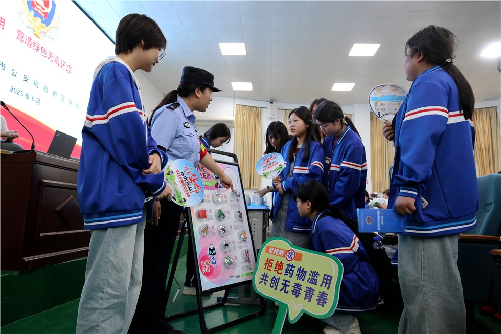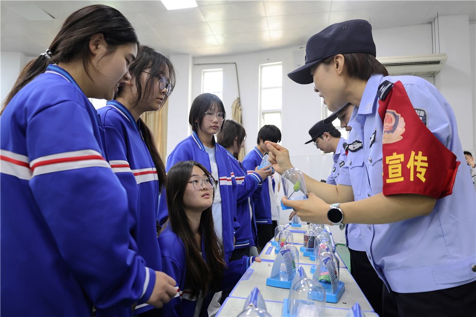 在禁毒知识问答环节,田艳丽警官以趣味互动方式激发学生参与热情。学生们踊跃举手抢答,答对者获赠禁毒主题文具、明信片等小礼品,现场气氛热烈。这种寓教于乐的形式,有效巩固了学生对毒品防范要点的掌握。活动现场陈列了20余种高仿真毒品模型,涵盖一些隐蔽性极强的毒品。警官们指导学生近距离观察,详细讲解辨别技巧:“新型毒品常伪装成日常食品,陌生人给的饮料、零食务必拒绝。”学生们边听边记,针对疑惑积极提问,民警一一耐心解答。