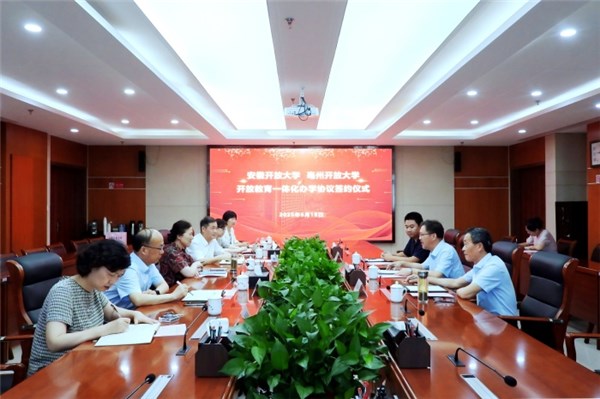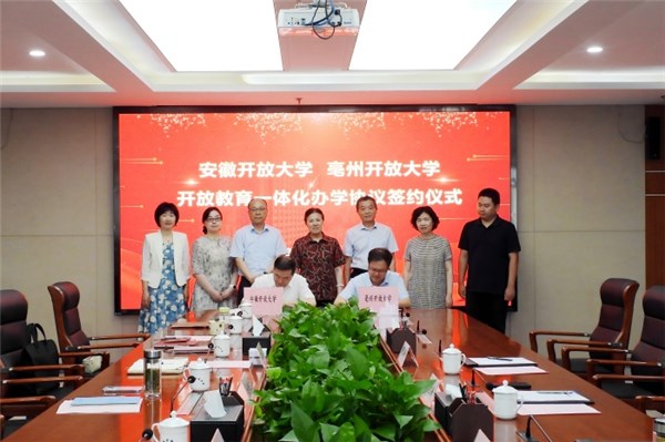 6月18日上午,安徽开放大学与亳州开放大学开放教育一体化办学签约仪式在安徽开放大学举行。安徽开放大学党委书记、校长杜爱玉,党委委员、副校长诸咸斌,亳州开放大学党支部书记、校长张立峰,党支部纪检委员、副校长王学杰出席签约仪式。安徽开放大学和亳州开放大学相关处室负责人参加仪式。