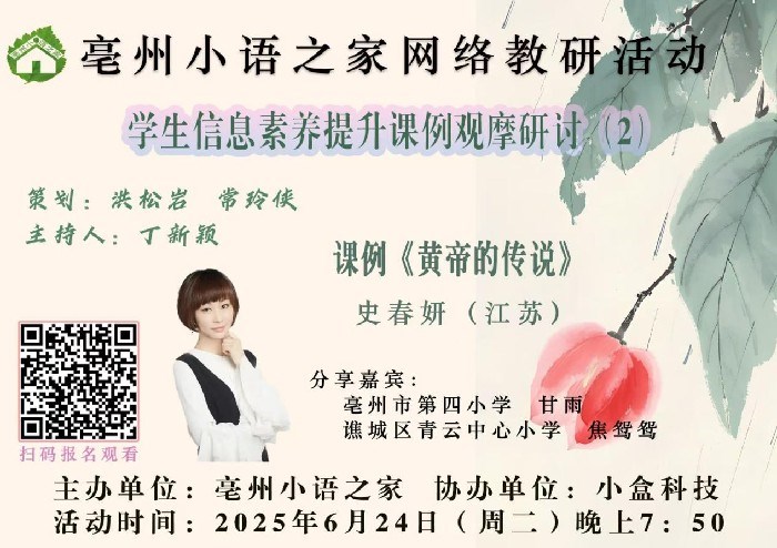 6月24日,“亳州小语之家”聚焦二年级语文课文《黄帝的传说》开展网络教研活动,汇聚教育智慧,赋能语文课堂教学,开启了一场古老民间传说与现代信息素养教学的邂逅。