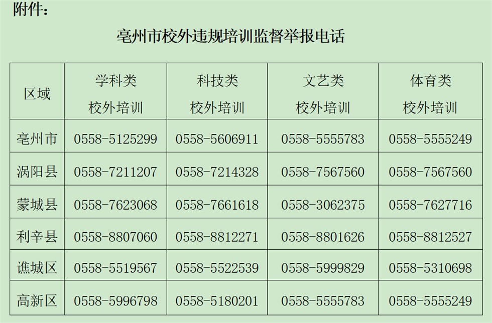 附件:亳州市校外违规培训监督举报电话